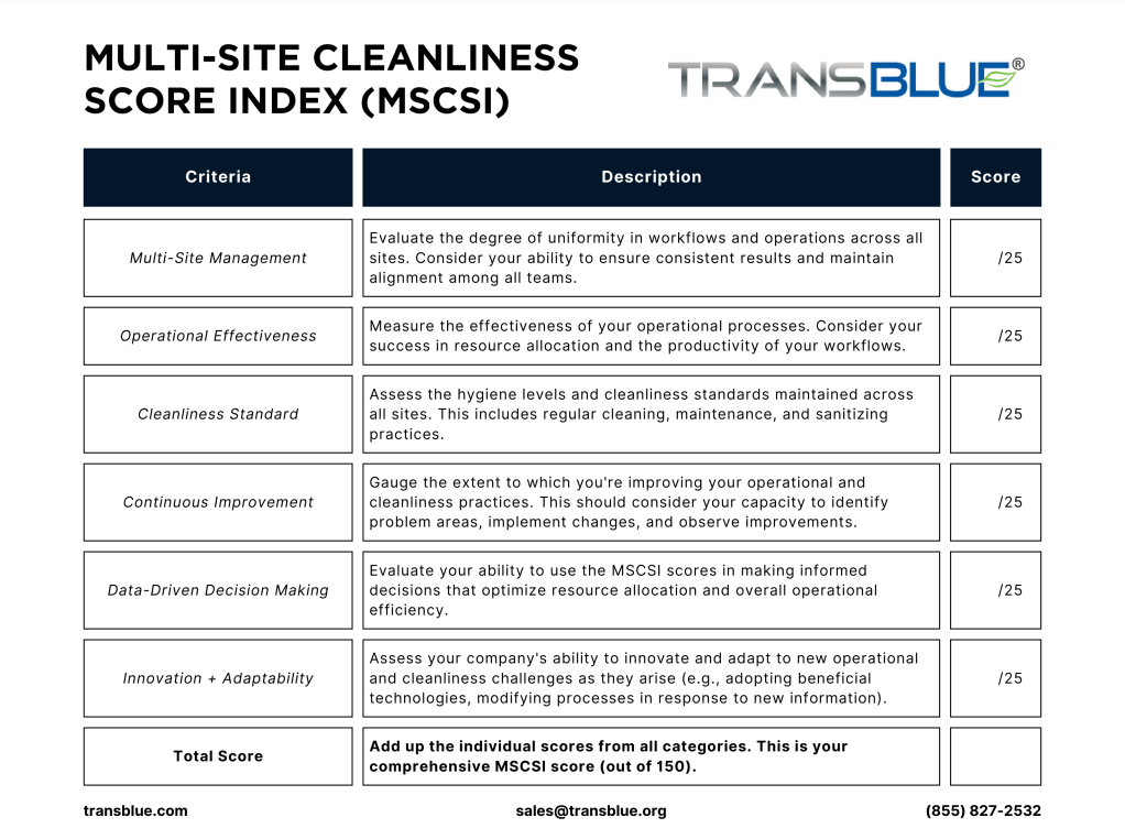 The MSCSI tool acts as a unifying force, promoting a uniform standard across all sites. By setting clear benchmarks for every aspect of operations, including cleanliness, it provides a common point of reference for all teams. This fosters alignment and consistency, eliminating the potential for discrepancies and inefficiencies across multiple locations. By streamlining operations, businesses can save costs associated with redundant processes and inconsistent practices.